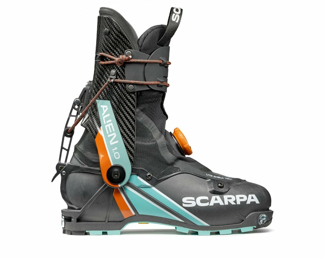 Setting the bar as the global best-seller for ski mountaineering training and racing boots, the Alien 1.0 represents the best blend of durability, functionality and weight savings. The hand-laid carbon fiber cuff is super stiff and crazy light, while the Carbon Grilamid® LFT shell increases durability with minimal weight gain overhand laid carbon fiber. The Speed Lock Lite ski-walk mechanism is integrated with the cuff closure via a Dyneema® cord, for quick, single-action transitions. The floating BOA® closure system ensures quick, easy and durable fit tensioning, and is protected by a reinforced gaiter that keeps snow out. The Vibram® outsole ensures traction on the snow for mandatory boot pack sections, while Qick Step-In fittings make clicking a breeze. If skimo racing is your passion, maximize your potential with the Alien 1.0.
