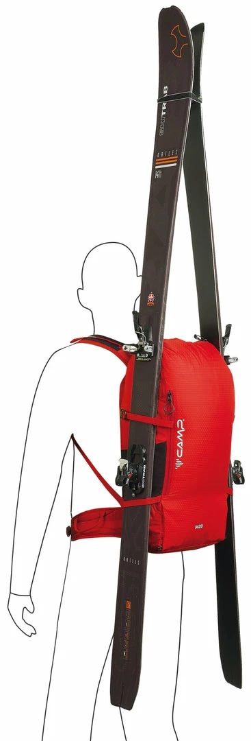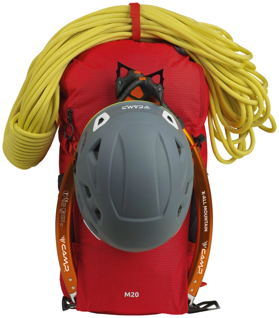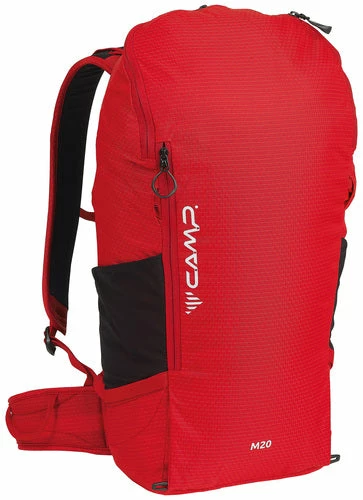 The M20 is a sophisticated lightweight pack for fast packing and general outdoor adventures. It incorporates many of the unique features found in the C.A.M.P. backpacks range like the Full BackDoor panel that allows access to the contents of the pack without having to remove everything on top before gaining access to gear at the bottom. Comfort is assured by the XAir ventilated back and breathable, ergonomic shoulder straps. The padded waist belt with two gear loops is removable for technical activities. A particular system allows for load adjustment using the two straps on the shoulders. The zip top lid combines with a drawstring closure for extra security and protection from the elements. Additional technical features include two technical ice axe holders with head-locker system and elastic cords, A-Frame ski carrying straps and external helmet carrying system that can be hidden when not in use, hydration bladder compatibility, and large external pockets for extra capacity.