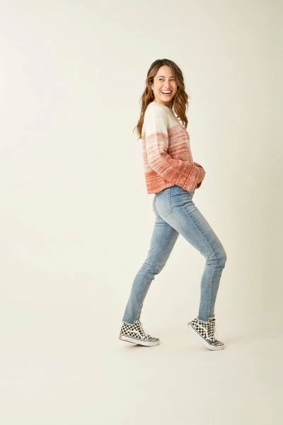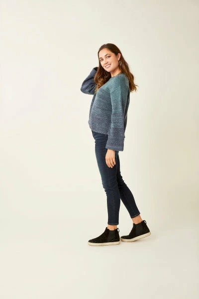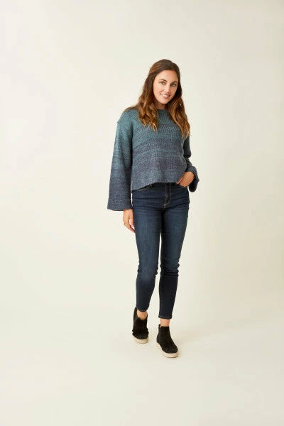 Crafted in a cozy cable knit, the Estes pairs a timeless material with of-the-moment details like wide rolled sleeves, a slight crop, and an ombre color.