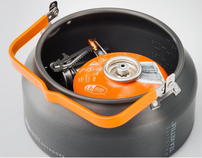 The Halulite Tea Kettle is an ultralight kettle for family campers and backpackers who demand efficiency in weight and fuel economy in a traditional kettle design.
