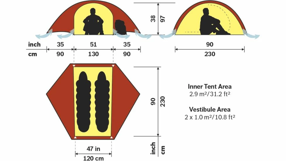 Two equal length crossing poles create the basic shape, and a shorter pole in the roof provides vestibule head room and adds to overall stability. Single opening pole sleeves make for quick pitching, and catenary patterning in the bottom of the outer tent walls offers constant venting. The inner tent doors are all mesh for full time air flow, and both vestibules can be rolled away for added cross venting.