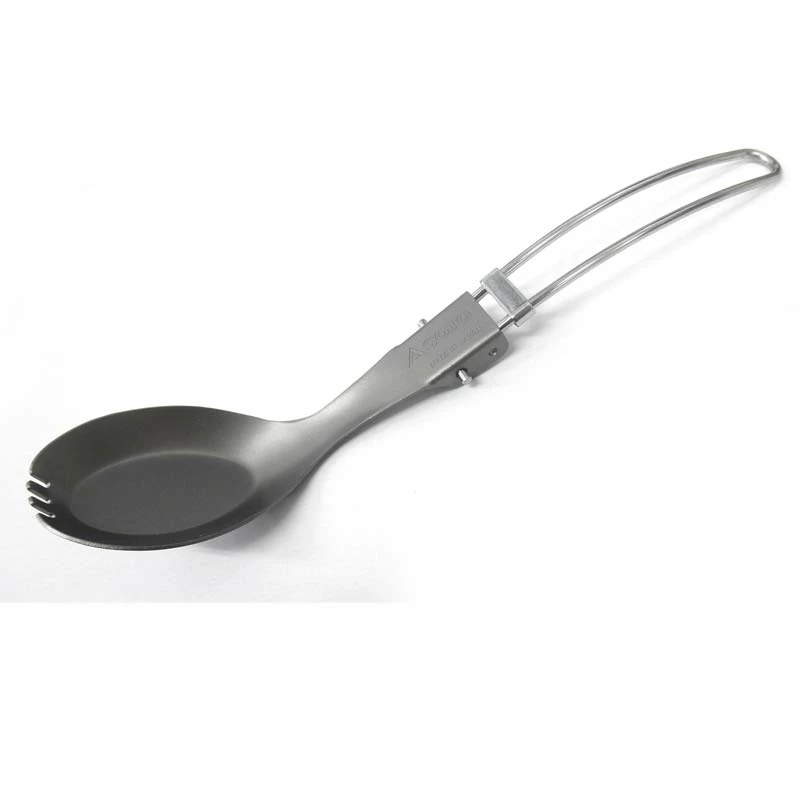 Foldable, ultra-light pocket spork with long handle and extra-large titanium bowl.