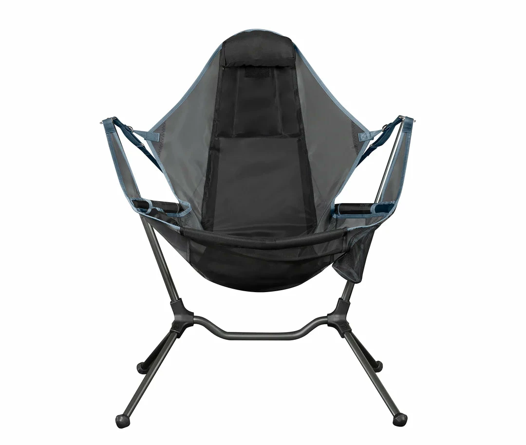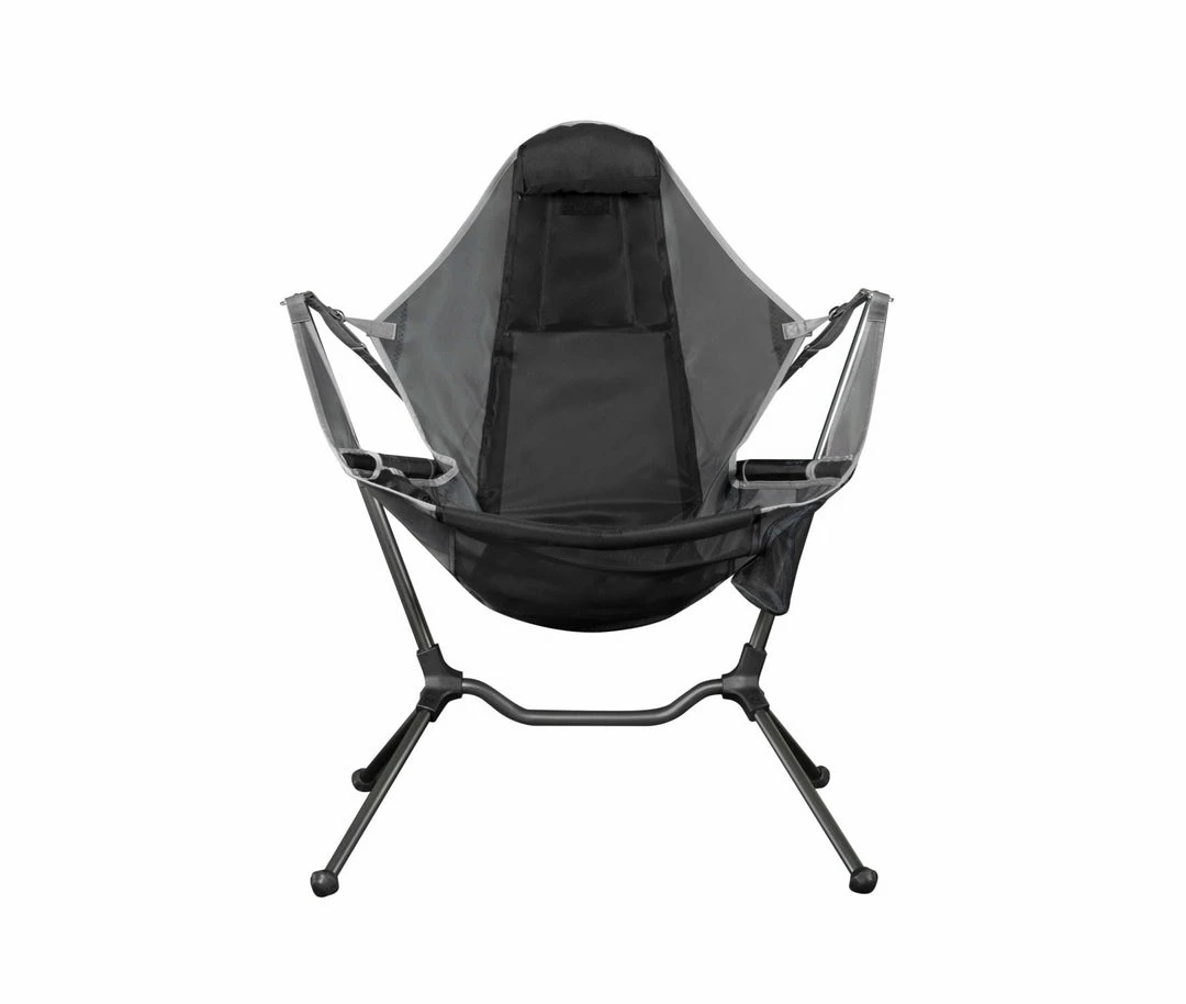 The next generation in camp comfort, Stargazeโข Recliner Luxury has been re-engineered for even more comfort and stability, with a lower center of gravity and extended fit range. This first ever swinging and reclining camp chair, takes relaxation to a new level. The swinging offers an exciting new sitting experience, with a relaxing motion that is designed for comfort. And when youโre ready to recline, simply lean back to activate the auto-reclining mechanism and enjoy a great view of the stars. Unlike rocking chairs, this chair is designed for use on any surface, including rocky, sandy or uneven ground, bringing the relaxation of motion to a host of new environments. The aircraft grade aluminum is designed to flex while you swing, dynamically suspending you in the air for an entirely new sitting experience. The deep lounge position is hard to beat. And Stargazeโข has all the little comforts you love, including an adjustable headrest, a no-spill cupholder and a stash pocket to keep your little things close at hand. This is the chair youโll want to take to camp, the beach, tailgating, your backyard or even your kidโs soccer game sidelines. The chair set-up is intuitive and easy, with just three quick steps so you can set it up and pack it up into the included padded carrying case quickly. The case comes with a shoulder strap and has room for you to stash your phone and keys. Youโll never think of sitting in the same way!