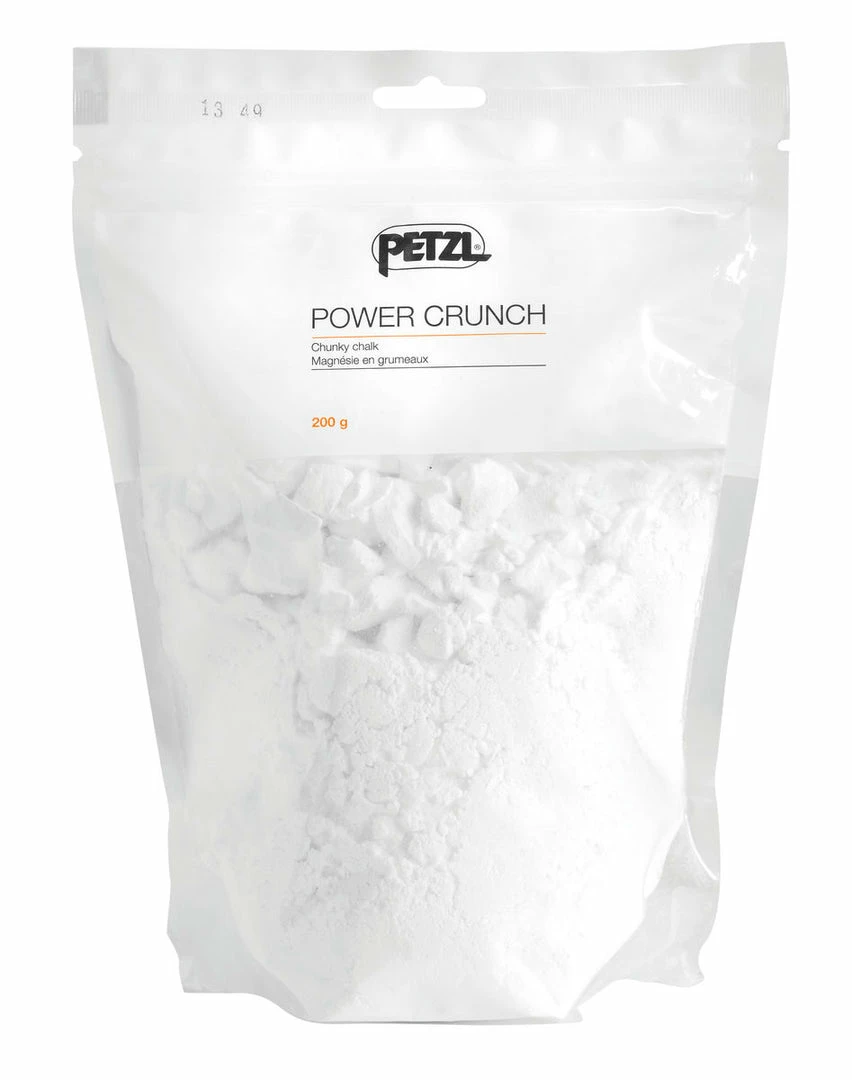 Power crunch chunky chalk improves grip when climbing. It is available in two sizes of packets to suit the climber’s needs: the 100 g packet fills one chalkbag and leaves a little extra, the 200 g packet can be stored for refills.