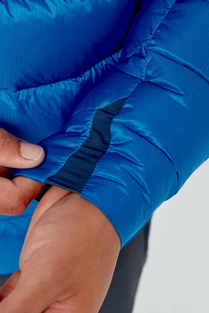As part of the Ascent range, the Electron Pro Jacket is designed for winter insulation, alpine climbing and year-round mountain use. The lightweight outer is built from 20D Pertex Quantum Pro ripstop nylon with a DWR coating for improved weatherproofing. Zoned midi and micro baffle stitch-through construction helps minimise bulk, eradicate cold spots and increase core warmth. The ethically-sourced 800FP RDS-certified European goose down is treated with a Nikwax® hydrophobic finish for resilient loft retention. Other key features include stretch-panel cuffs, a helmet-compatible hood with stiffened peak and a pair of harness-friendly YKK® zipped hand pockets.