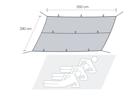 Lightweight shelter for 2-3 people. 4 Corner pockets hold guylines. Multiple anchor loops: 16 on edges, 3 on top. 8 pegs and 4 additional guylines (included) allow the tarp to be anchored securely.